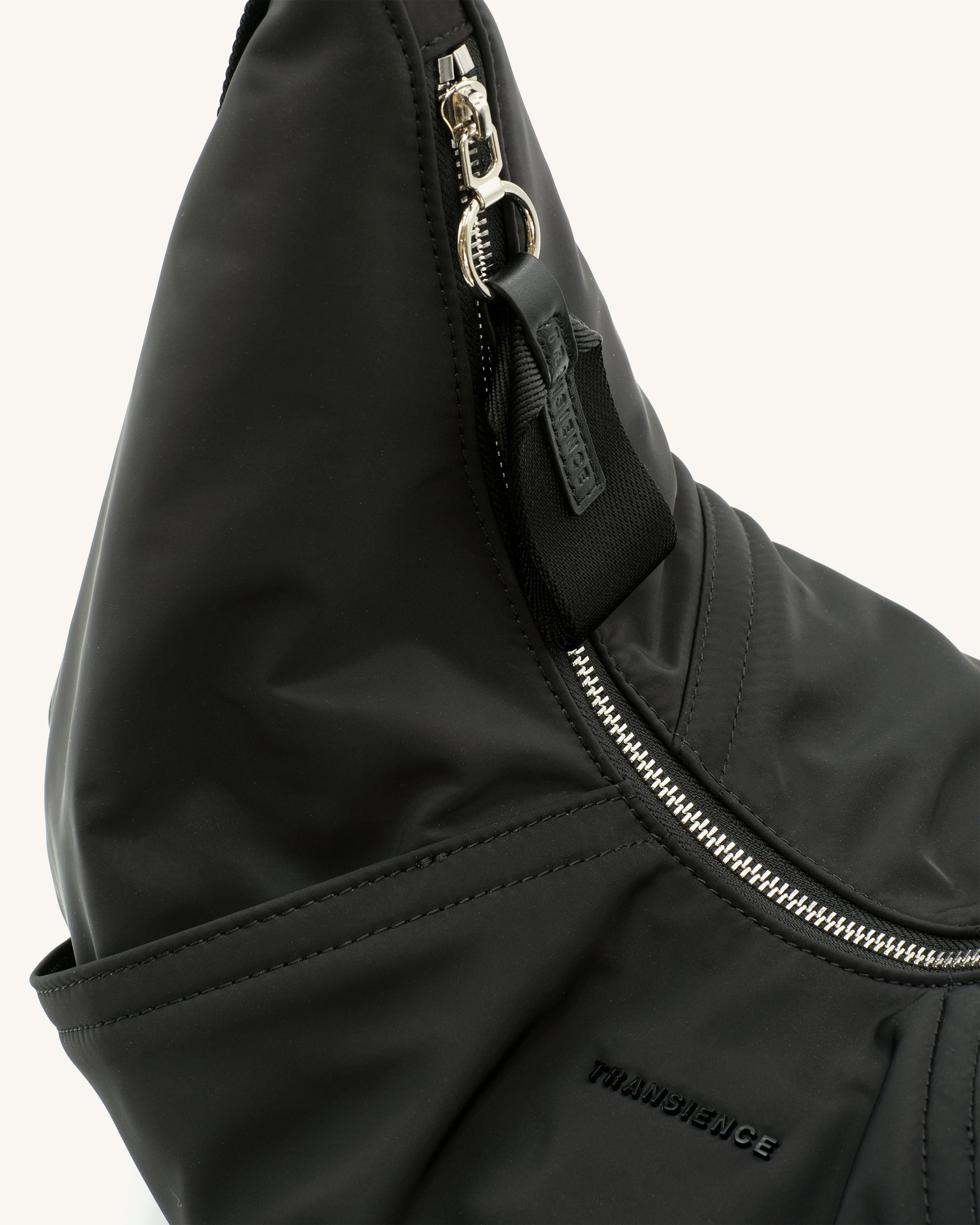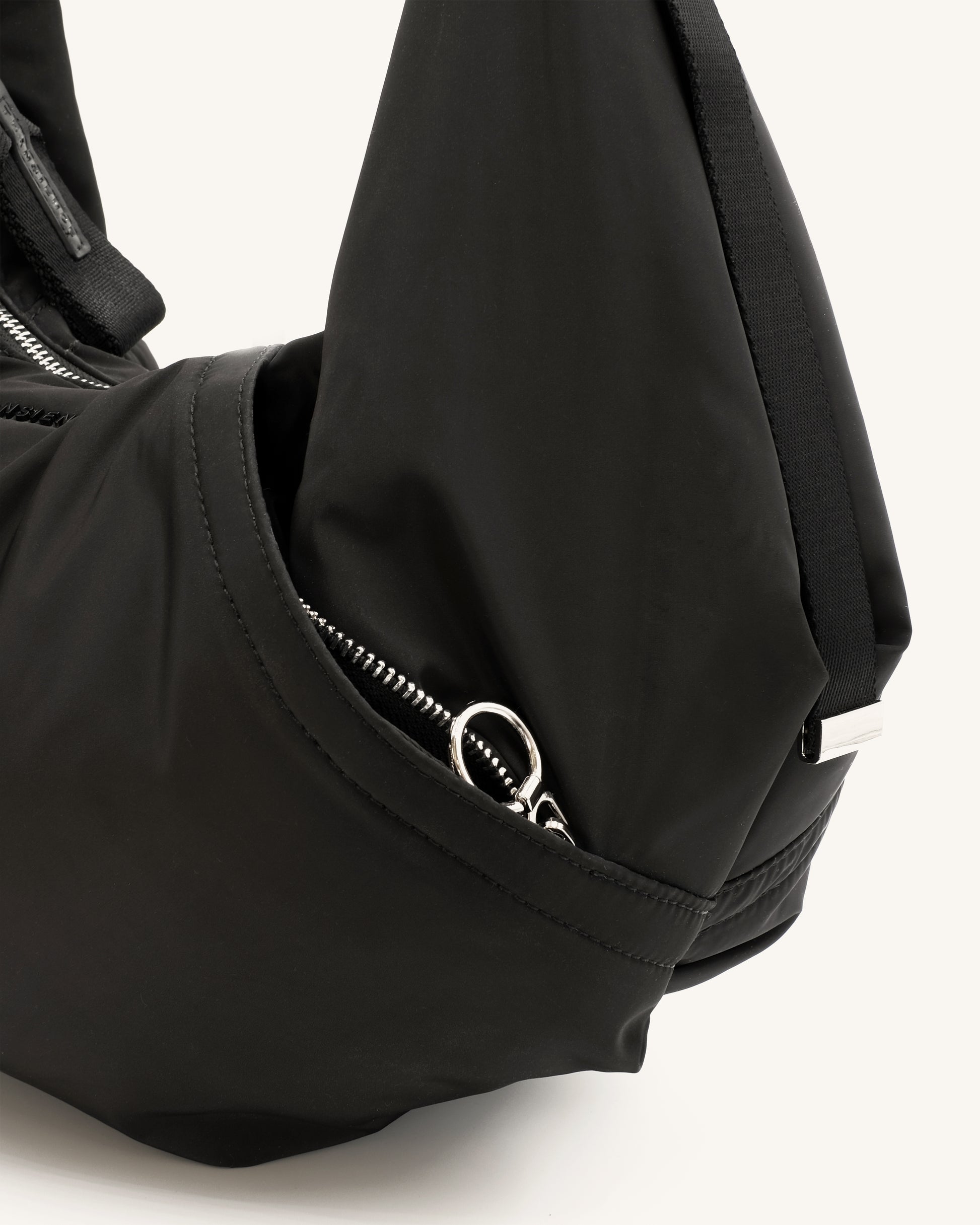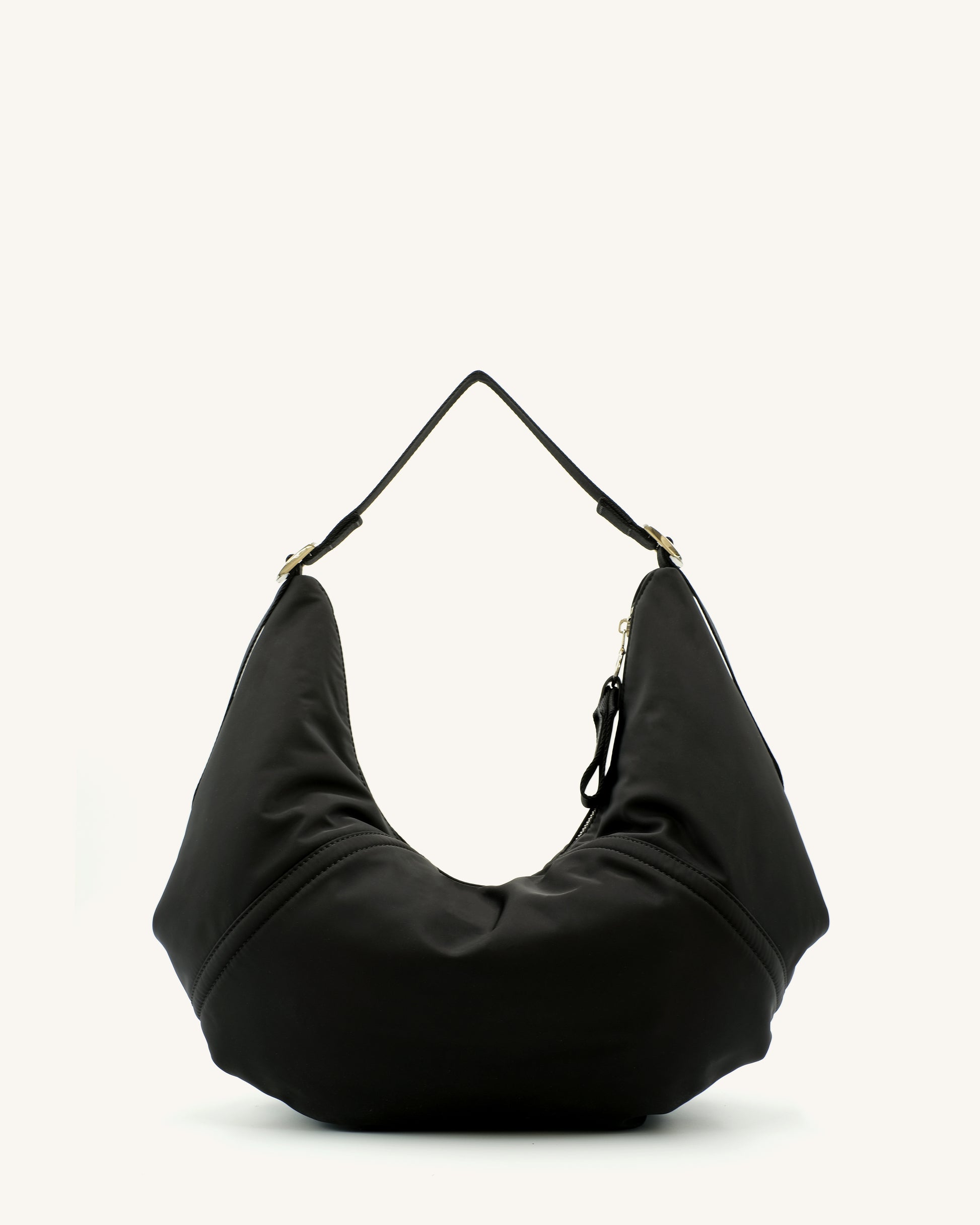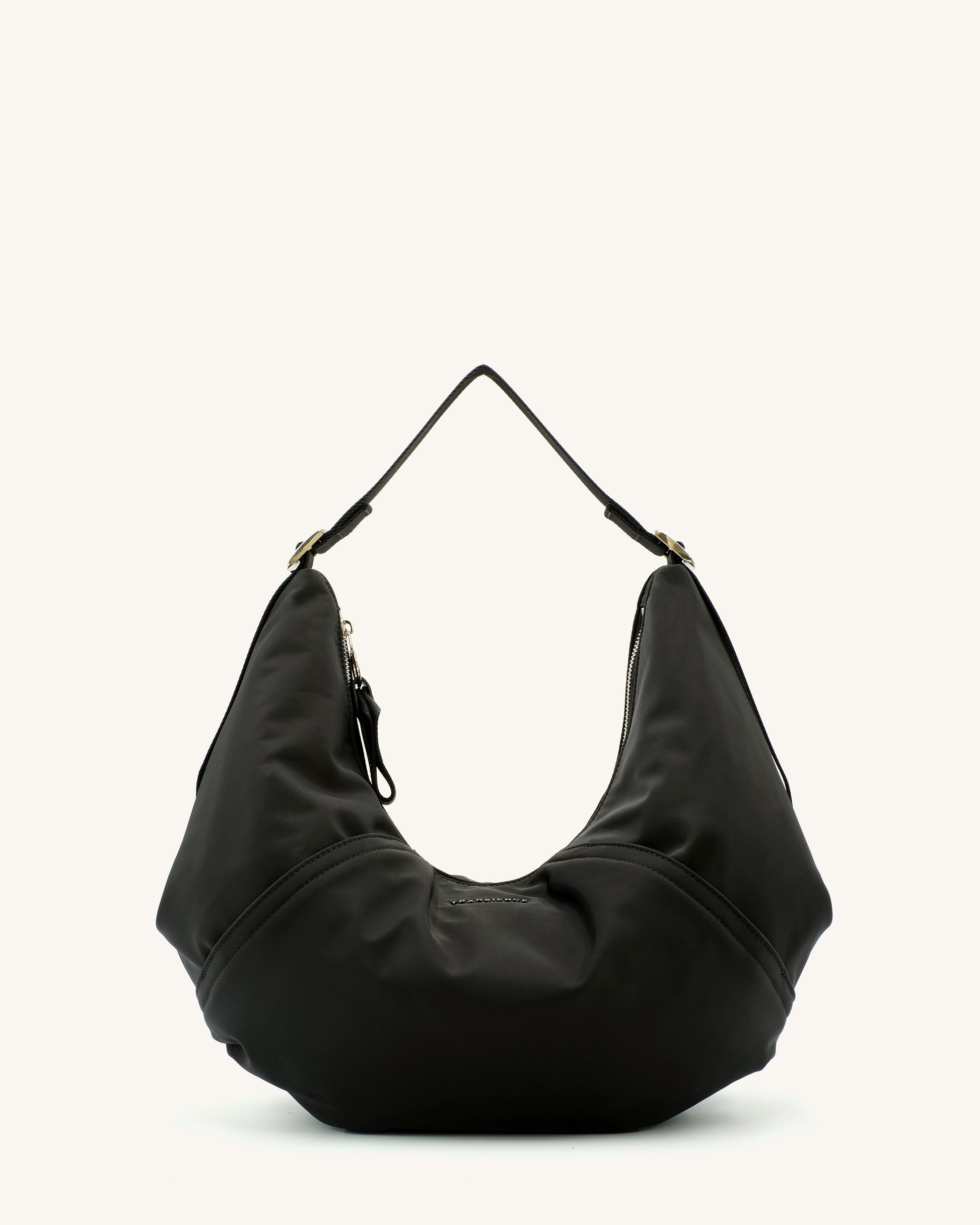 Lightweight nylon puffer hobo bag, with adjustable shoulder to crossbody top strap and hidden front zip pockets.