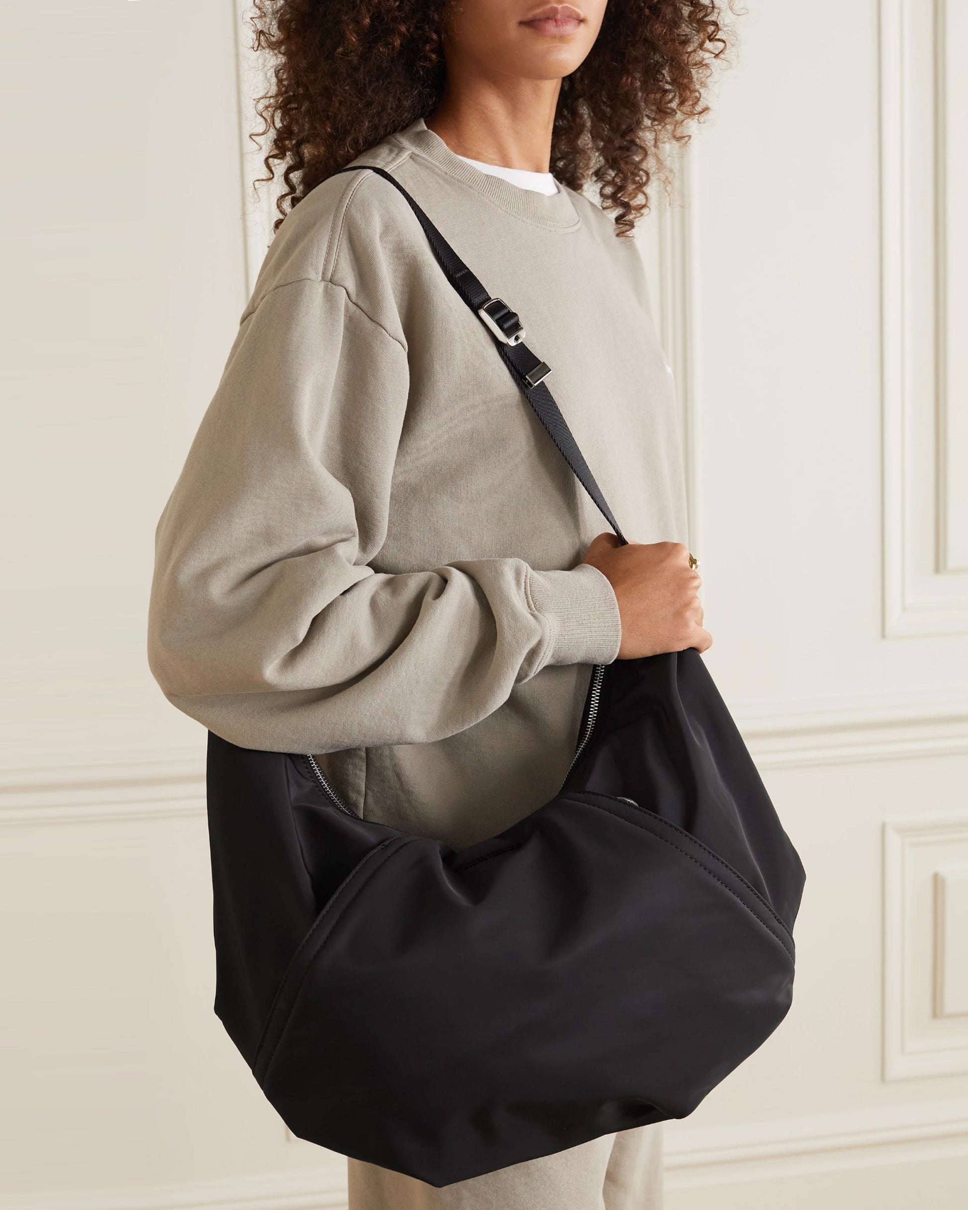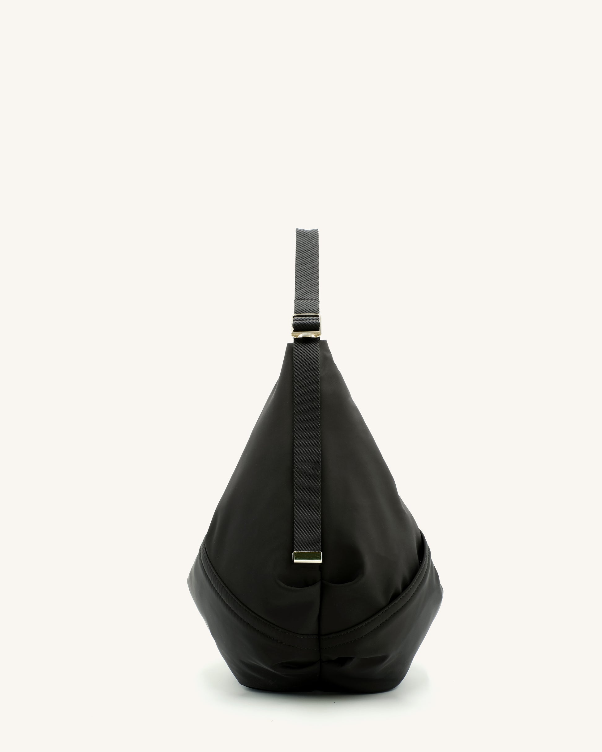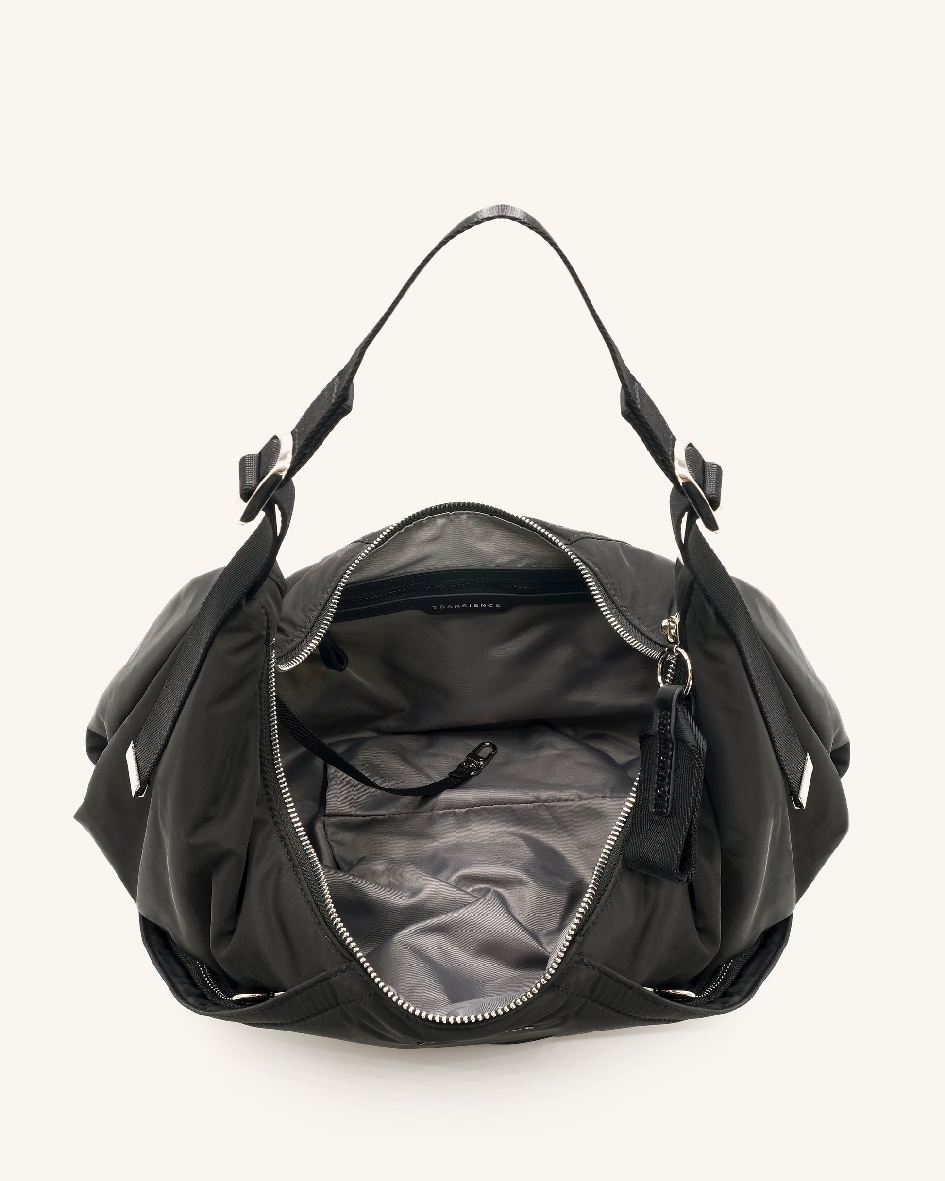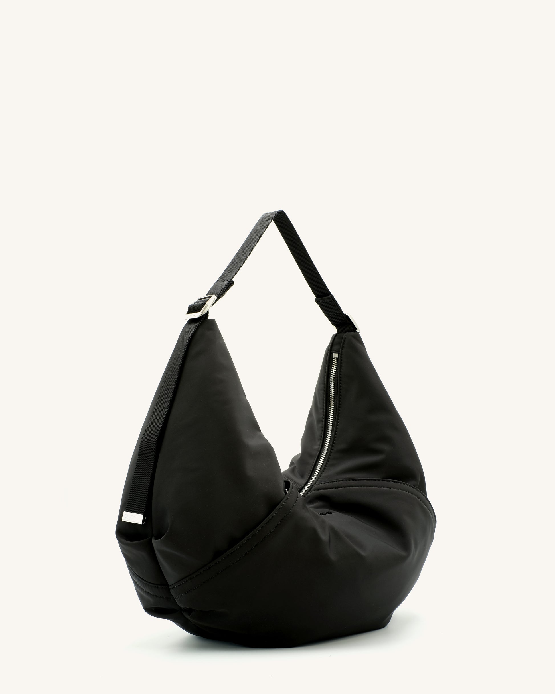 Lightweight nylon puffer hobo bag, with adjustable shoulder to crossbody top strap and hidden front zip pockets.