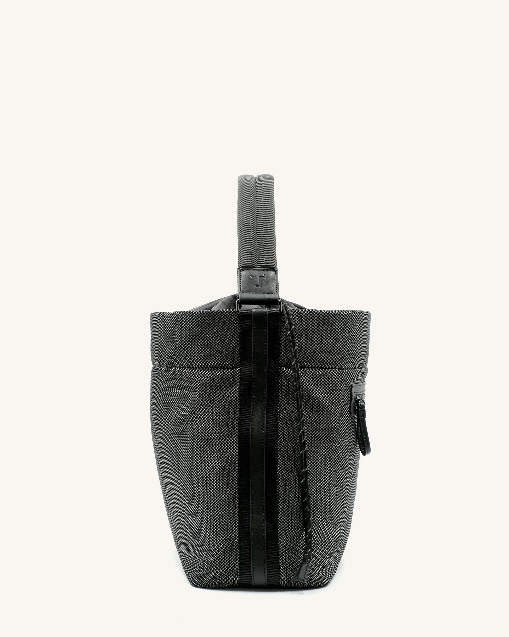 Spacious, lightweight water resistant, bucket bag with drawstring top closure.